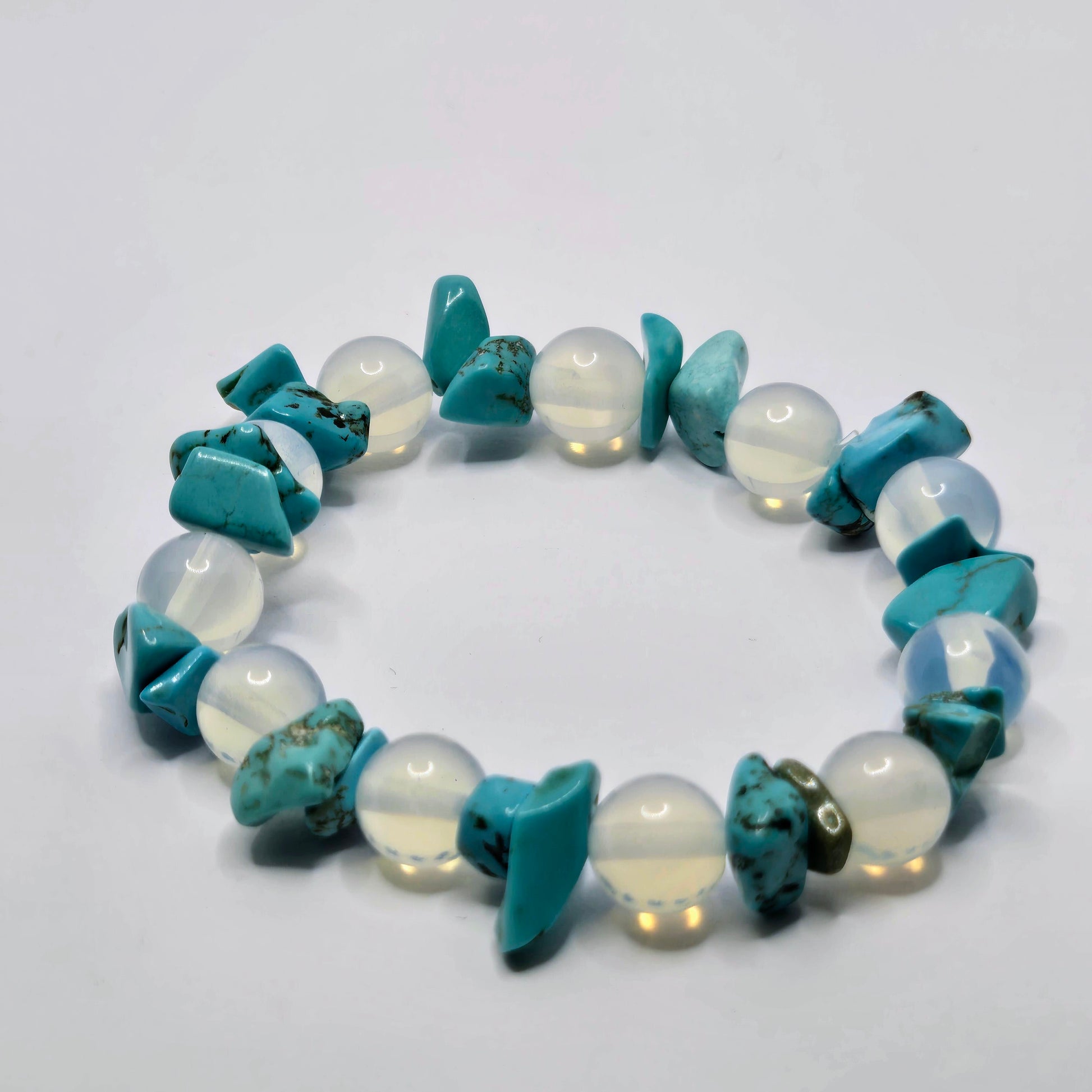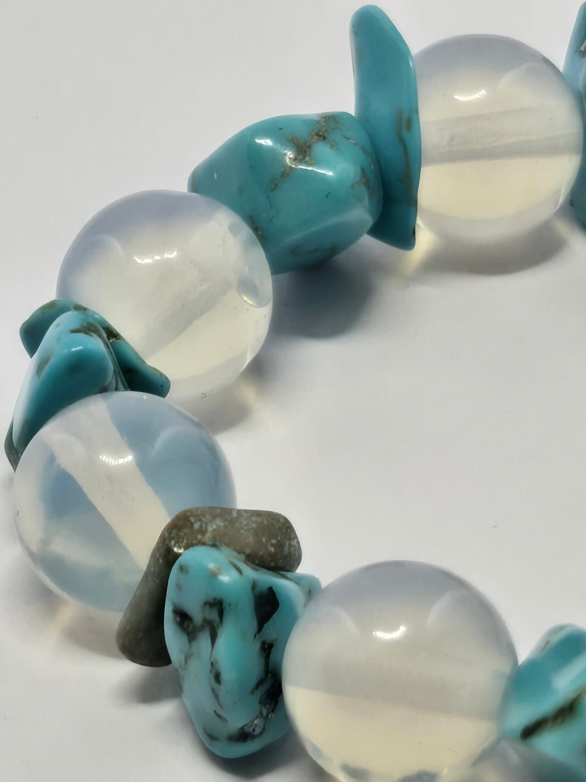 A soothing blend that stabilizes the mind during periods of change. Howlite chips calm the conscious mind, relieving stress and promoting patience, while Opalite spheres aid in emotional transition and spiritual unfolding. Wear this piece to find a tranquil foundation from which your inner self can gently bloom.