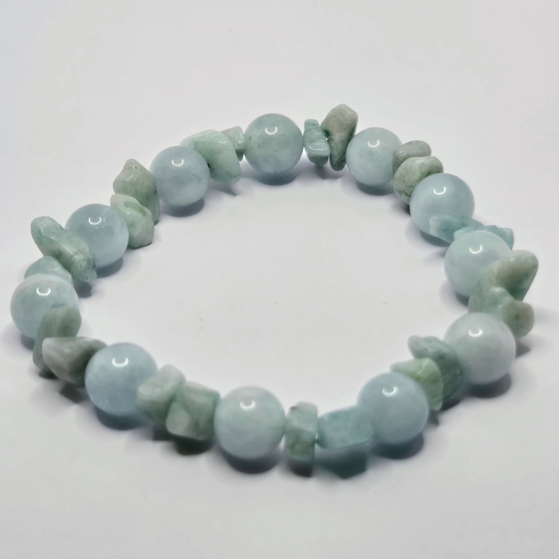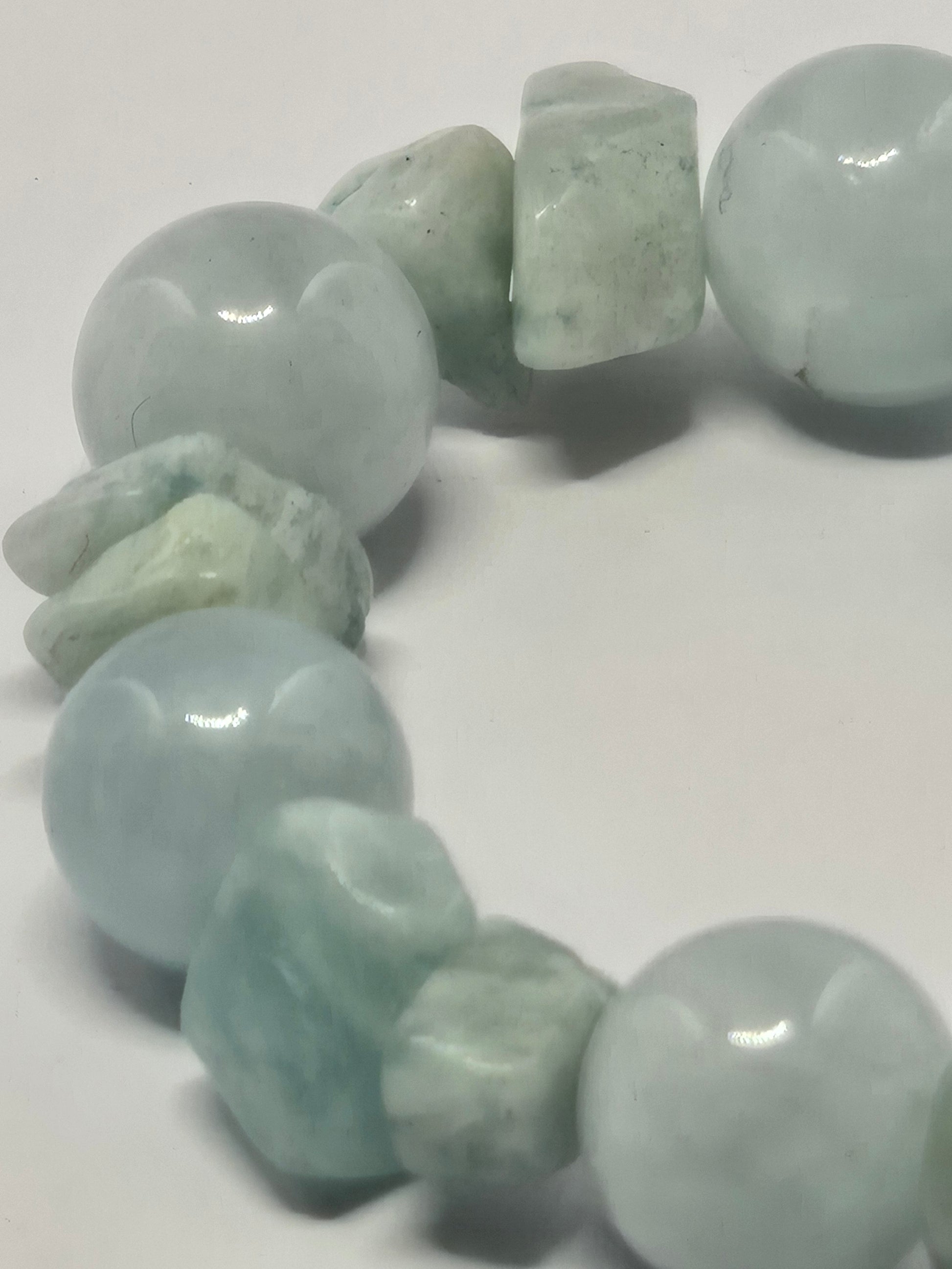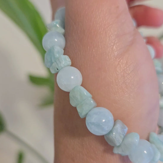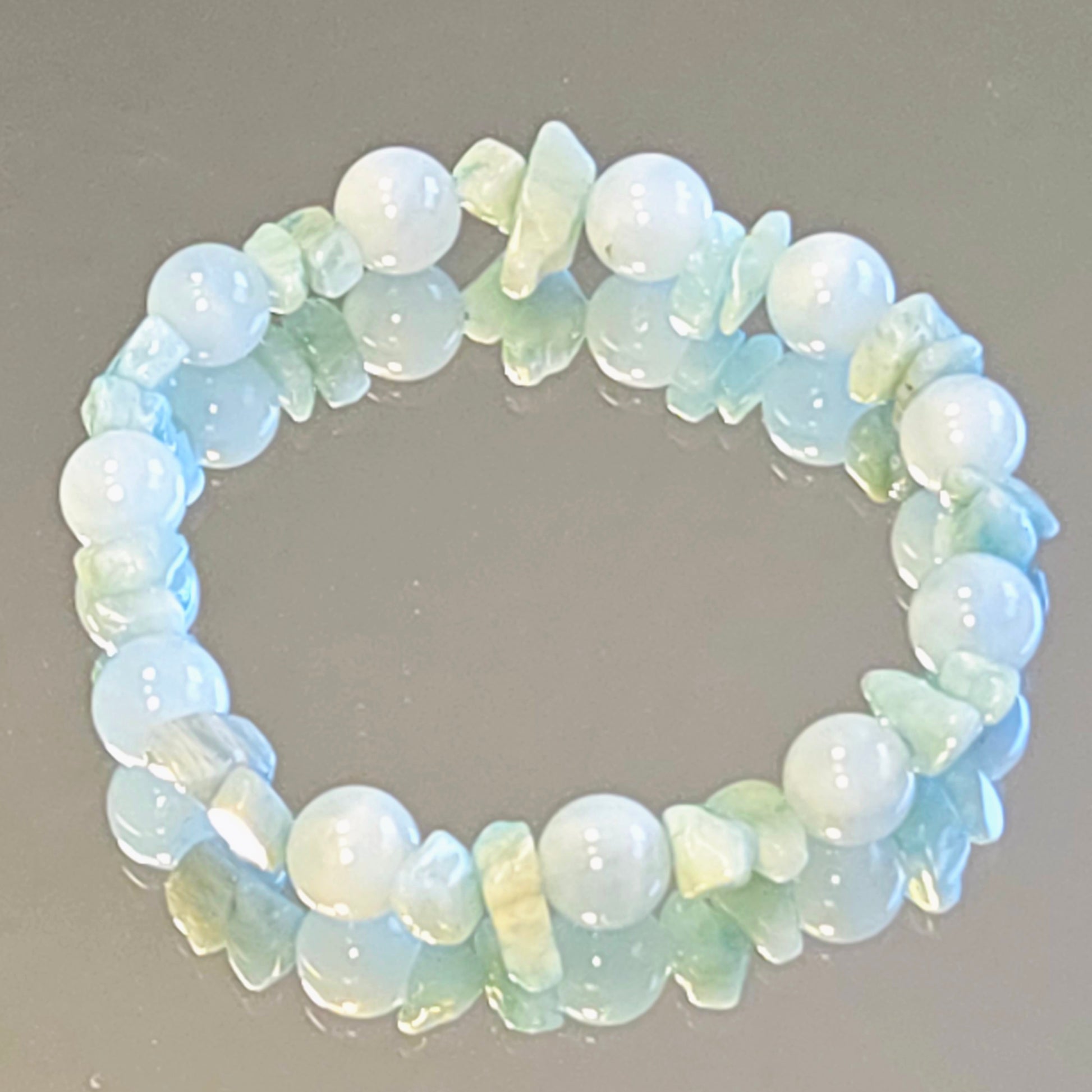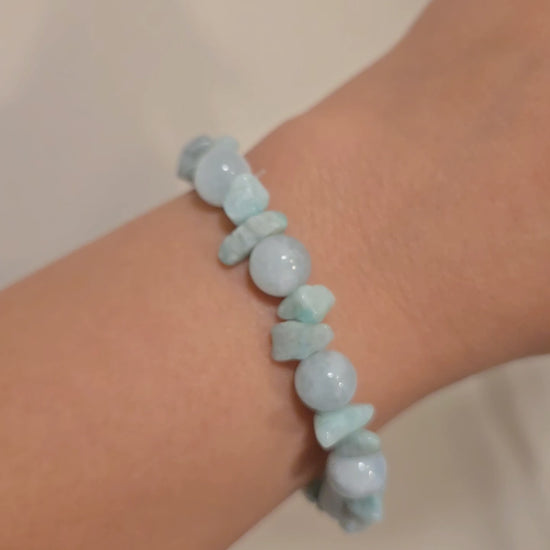 A beautiful monochromatic piece dedicated entirely to tranquility. This Aquamarine mix promotes deep tranquility and emotional stillness, allowing you to find the courage to communicate without anxiety. The perfect bracelet for composing yourself and speaking from a place of genuine, unhurried peace.