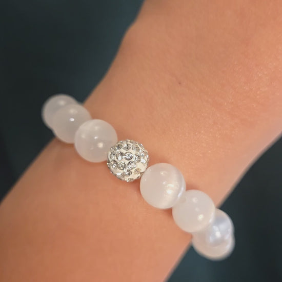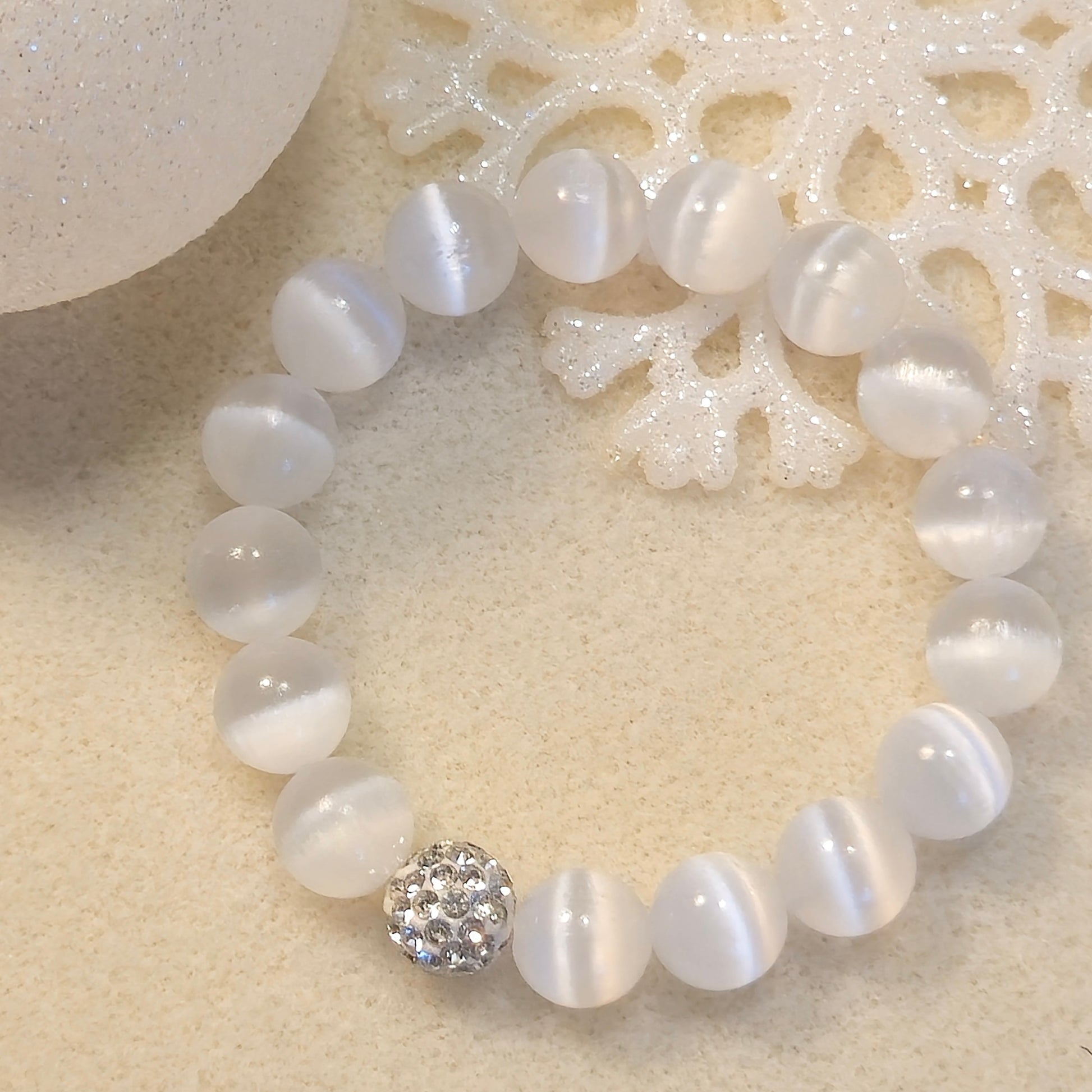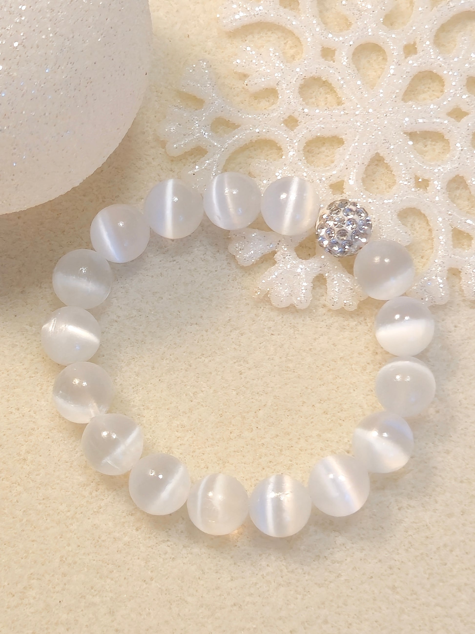 Selenite has been revered for centuries, prized for its luminous white clarity and calming energy. Each bead carries the timeless allure of moonlight and peace, grounding you in serene harmony while the crystal accents add a modern, luminous edge.